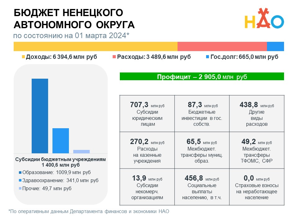 Государственный долг НАО с начала года не изменился и по состоянию на 1 марта составил 0,7 млрд рублей. Его структура состоит из бюджетных кредитов в сумме 465 млн рублей и ценных бумаг - 200 млн рублей.